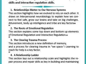 Book 5 is about building interactive regulation skills and sturdy relationships. It illustrates and explores repair skills, body up intelligence and how we transmit interactive regulation skills to the next generation. Building sturdy relational containers is a cultural rather than an individual skill. It is something that people do together, not something that an individual does. It requires an ability to stay attuned to one’s internal self and other people at the same time. We learn this in relationship.  Even expecting that this is possible is learned in relationship, from our family and our tribe.